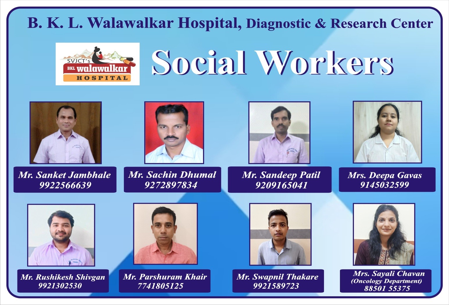 - International standards quality care in collaboration with Tata Memorial Centre: Tata Memorial Centre Team of Oncologist, Onco-surgeons, Radiation oncologist, Pathologist, Statisticians and Administrators regularly visiting Walawalkar Hospital to ensure highest Quality Oncology care. The hospital itself is an ISO certified institution.